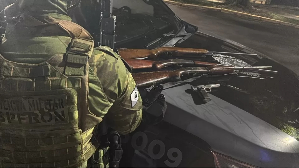 Ao chegar no imóvel do suspeito, o homem desobedeceu a ordem de abordagem e correu para dentro da casa. No interior da residência foram localizadas uma pistola e três espingardas.
